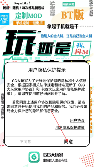 1、首次打开GG大玩家,阅读并同意《用户协议》《用户隐私保护政策》,点击【同意】进入应用。
