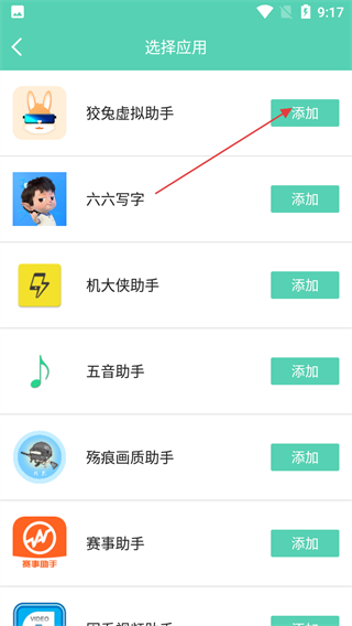 3、在“选择应用”页,找到目标应用(如“狡兔虚拟助手”),点击对应【添加】按钮。