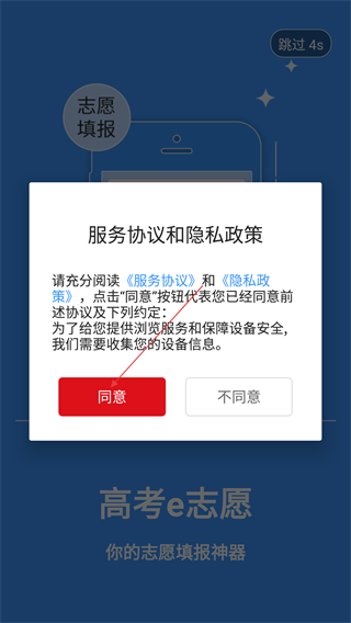 1、打开应用后,阅读“服务协议和隐私政策”,点击“同意”进入主界面,可查看分数对应的冲刺/稳妥/保底院校推荐。