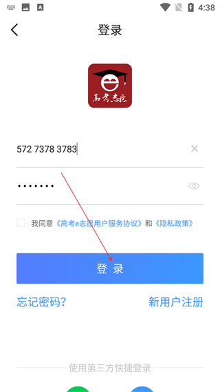4、返回登录页面,输入手机号、新密码并勾选同意协议,点击“登录”即可进入账号,使用志愿填报等功能。