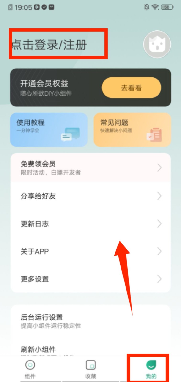 4、切换到 “我的” 页面,点击 “点击登录 / 注册” 完成账号操作后,可查看使用教程、参与会员活动。