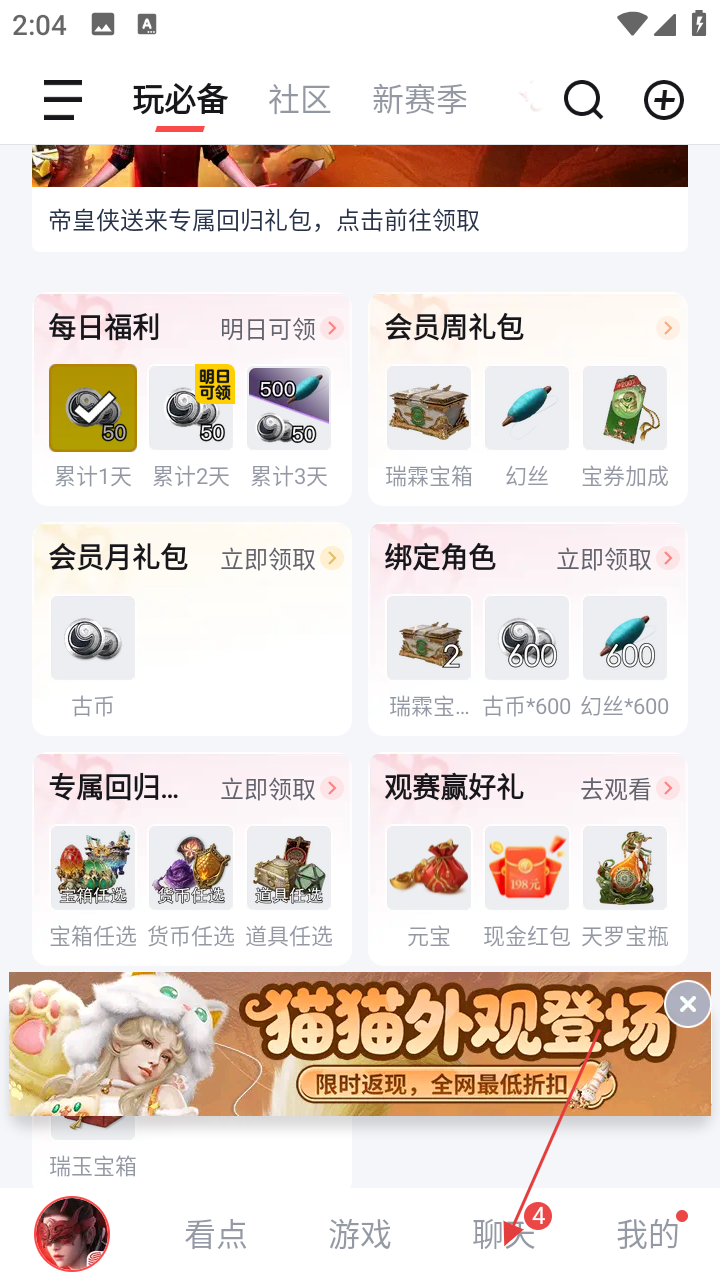 1、打开网易大神APP,进入主界面后,点击底部导航栏中的【聊天】选项。