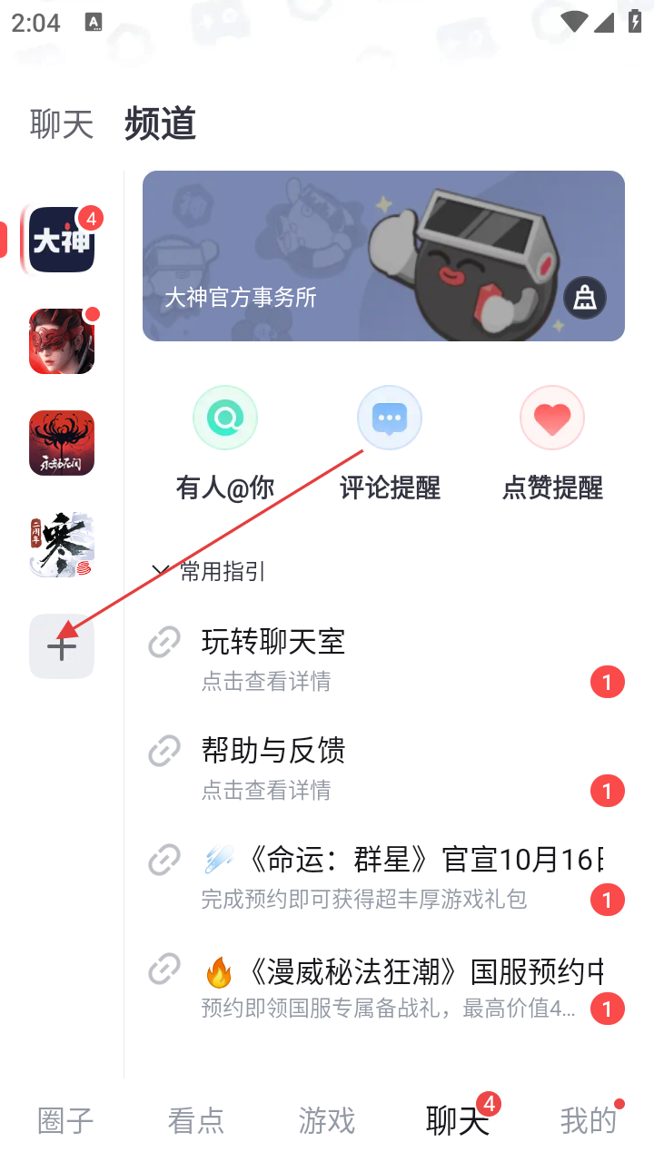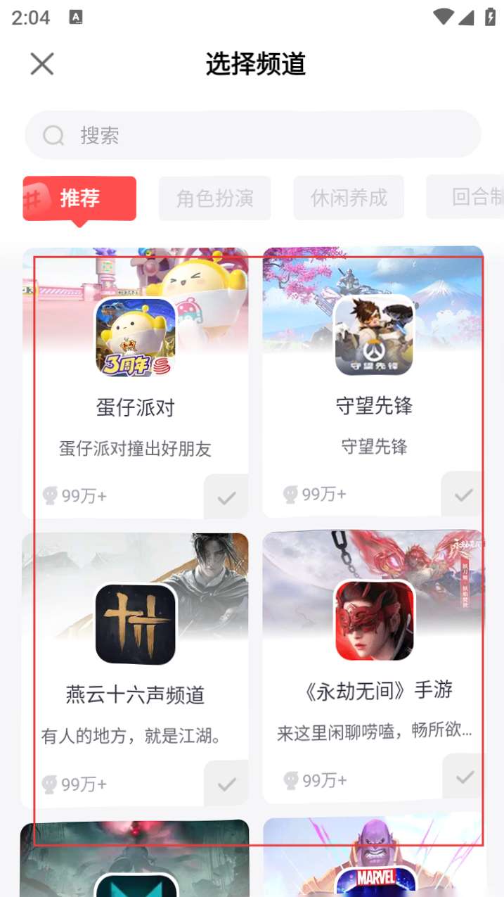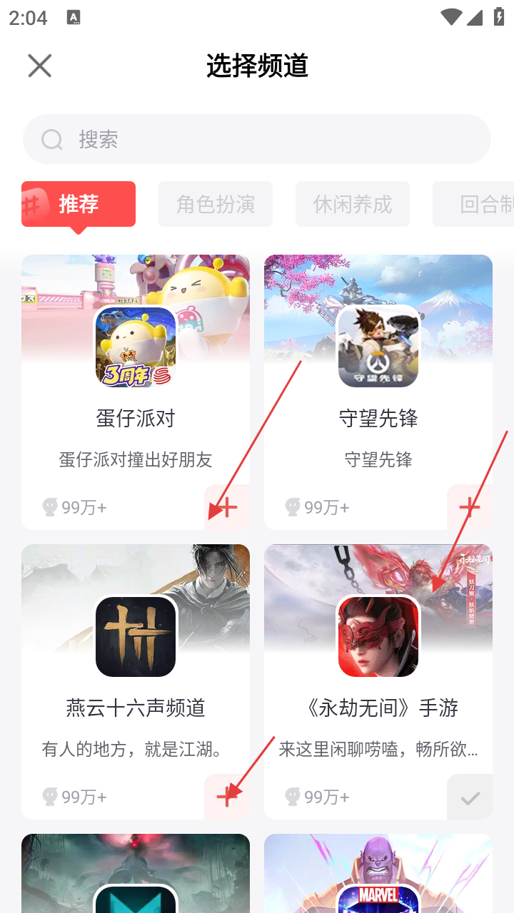 3、进入“选择频道”页面,在推荐的游戏频道中,找到想要添加的频道,点击频道下方的“+”号,即可添加该频道。