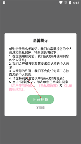 1、打开应用后,阅读“温馨提示”并点击“同意授权”,进入应用主界面。