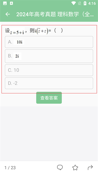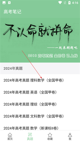 3、在真题列表中选择目标试卷(如“2024年高考真题理科数学(全国甲卷)”),进入题目页面。
