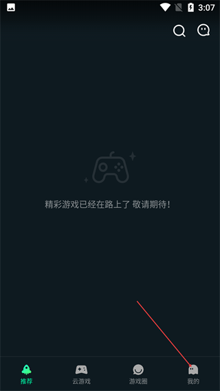 2、在APP首页(推荐页),可查看平台游戏相关动态,当前显示游戏内容待上线;点击底部“我的”入口进入个人中心。