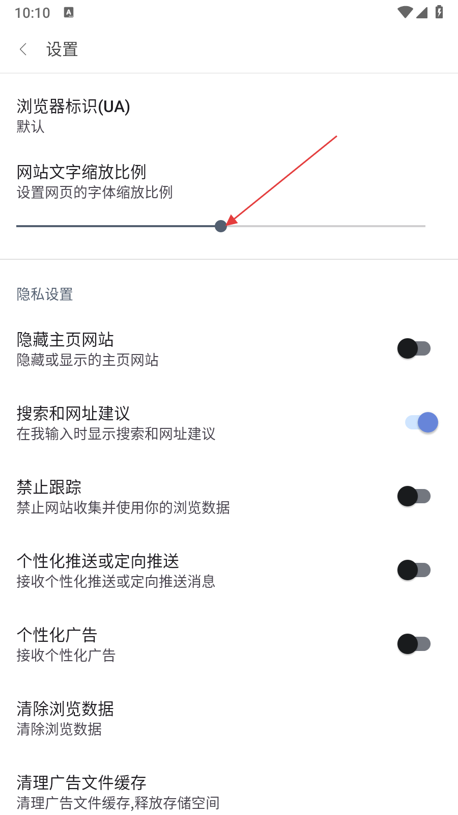 3、在【设置】界面中,找到【网站文字缩放比例】的滑块,可拖动该滑块来调整网页字体的缩放比例,以适应阅读需求。