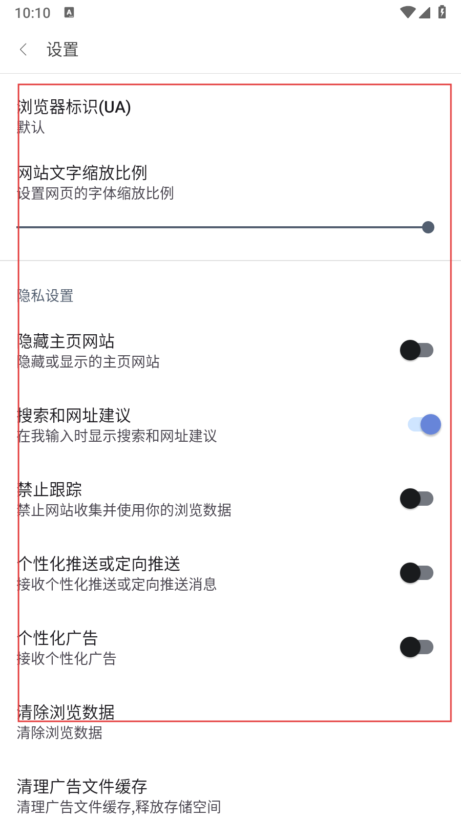4、在【设置】界面中,还可查看并根据需要调整浏览器标识、隐私设置等多项功能,如隐藏主页网站、管理个性化推送等。
