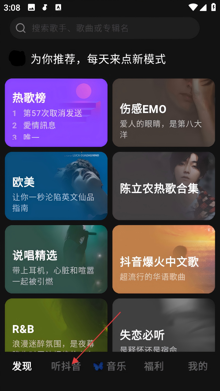 1、打开汽水音乐APP,点击底部【听抖音】,进入相关长视频推荐页面。