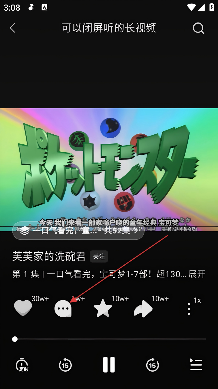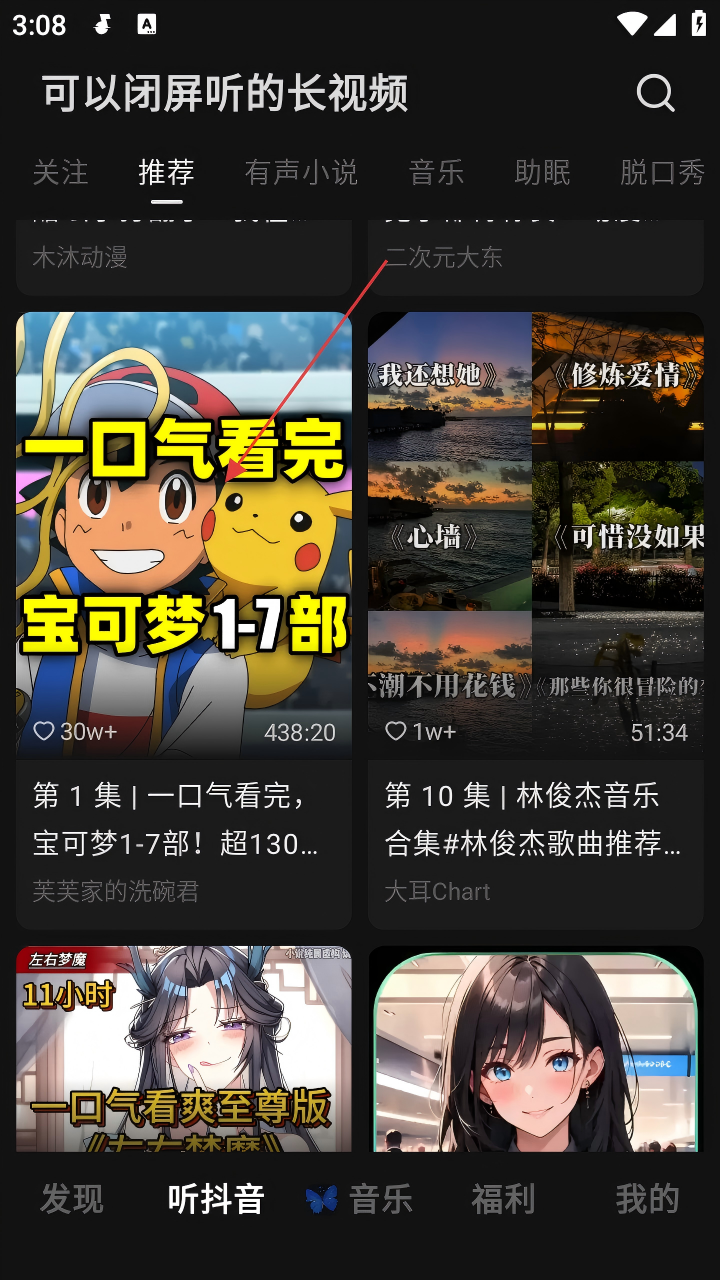 2、在“听抖音”页面,挑选感兴趣的长视频,比如“一口气看完宝可梦1-7部”。