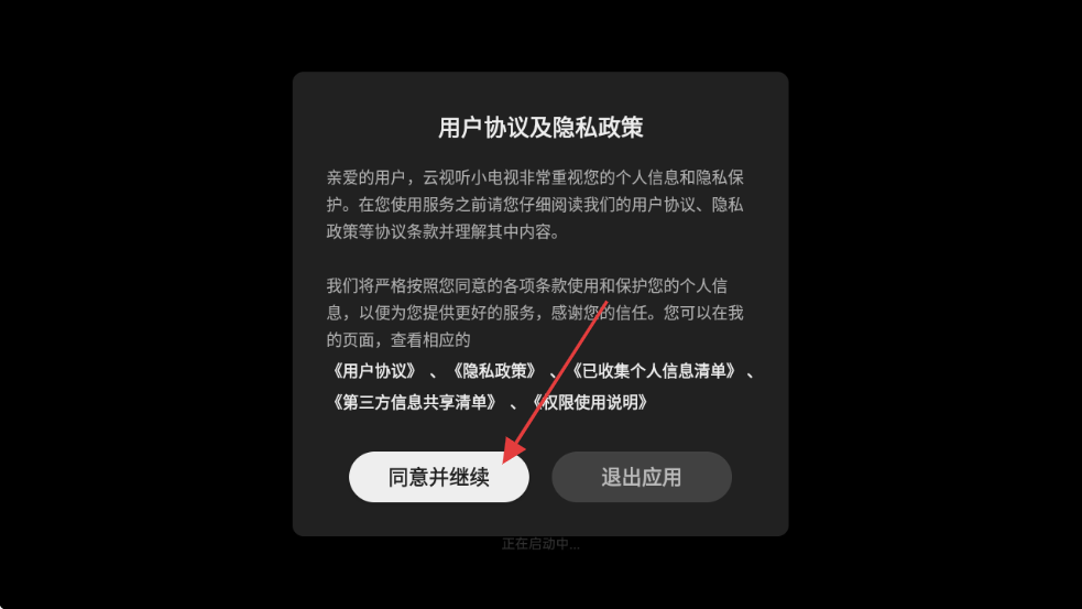 1、打开云视听小电视,弹出【用户协议及隐私政策】提示框,点击【同意并继续】进入主界面。