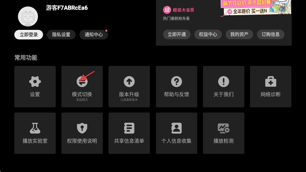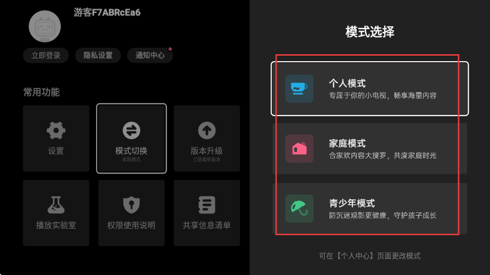4、在模式选择界面,可挑选【个人模式】【家庭模式】【青少年模式】等不同使用模式。
