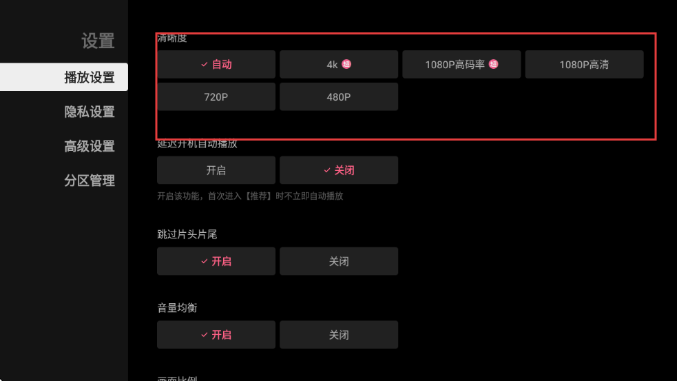 4、在设置页面,进入【播放设置】,可选择【自动】【4k】【1080P高码率】等清晰度选项。