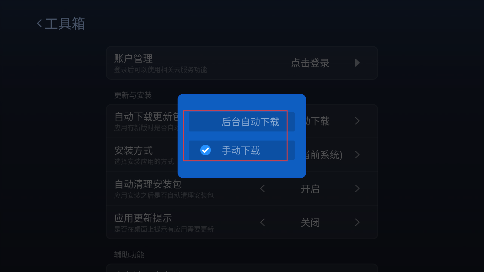 4、在弹出的选项中可选择【后台自动下载】,应用有新版时将自动下载安装包。