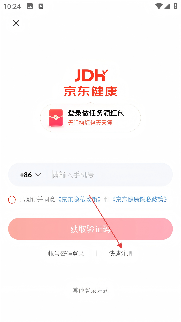 1、进入京东健康登录页面,若要快速注册,点击【快速注册】选项。