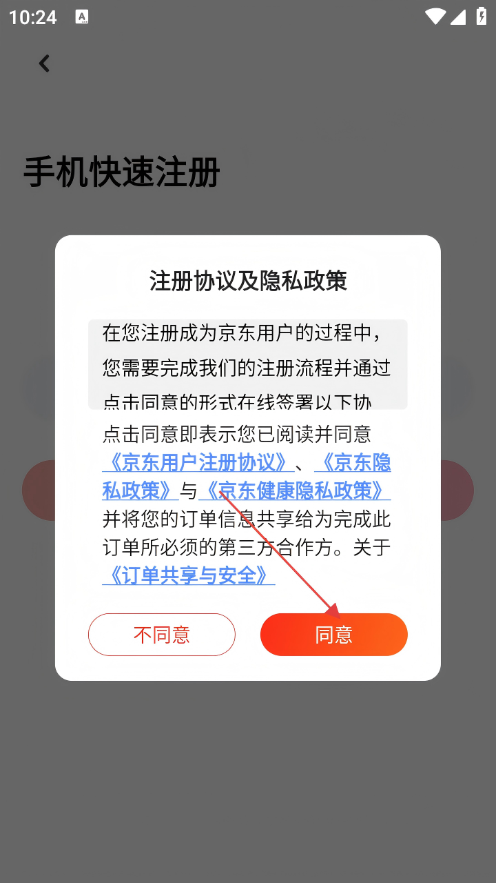 2、在【注册协议及隐私政策】弹窗中,阅读相关协议后,点击【同意】。