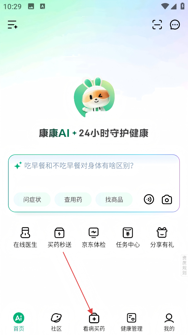 1、打开京东健康APP,在首页点击底部【看病买药】选项。