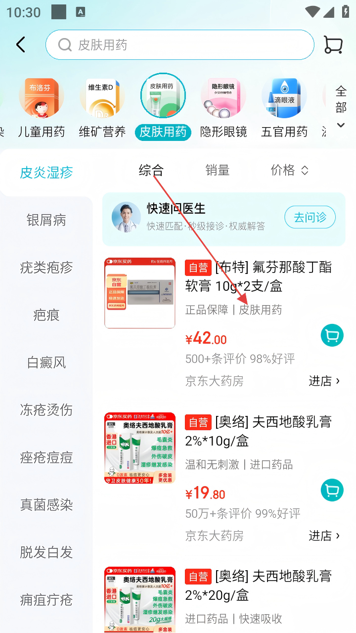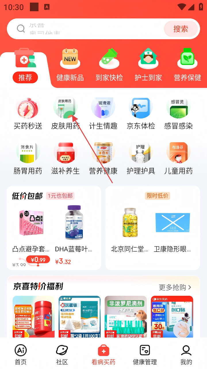 2、进入【看病买药】页面后,找到【皮肤用药】分类并点击。