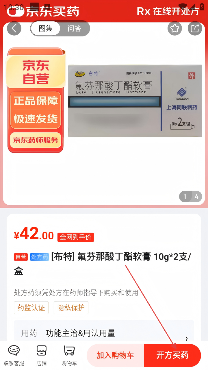3、在皮肤用药商品列表中,选择所需的药品,如[布特]氟芬那酸丁酯软膏,点击进入商品详情页。