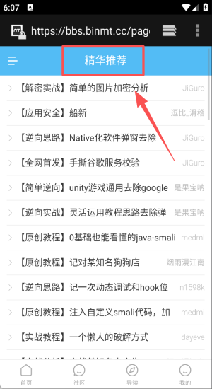2、进入社区精选教程,跟随逆向实战帖学习解密与Hook基础思路。