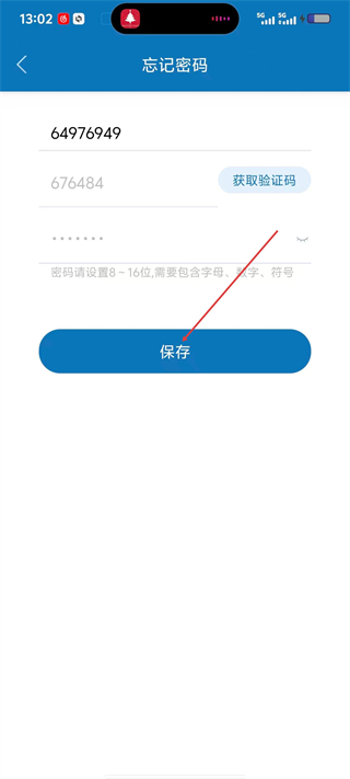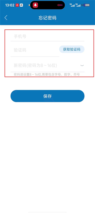 3、在忘记密码页,依次完成:输入注册用的手机号、点击【获取验证码】并填写、设置8-16位包含字母/数字/符号的新密码。