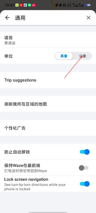 4、在通用设置中,点击【公里】选项,将导航单位从英里切换为公里,适配国内使用习惯。
