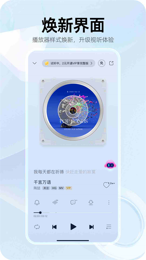 播放器新增「AI伴听」,智能生成契合歌曲的深度解读,陪你沉浸听歌。