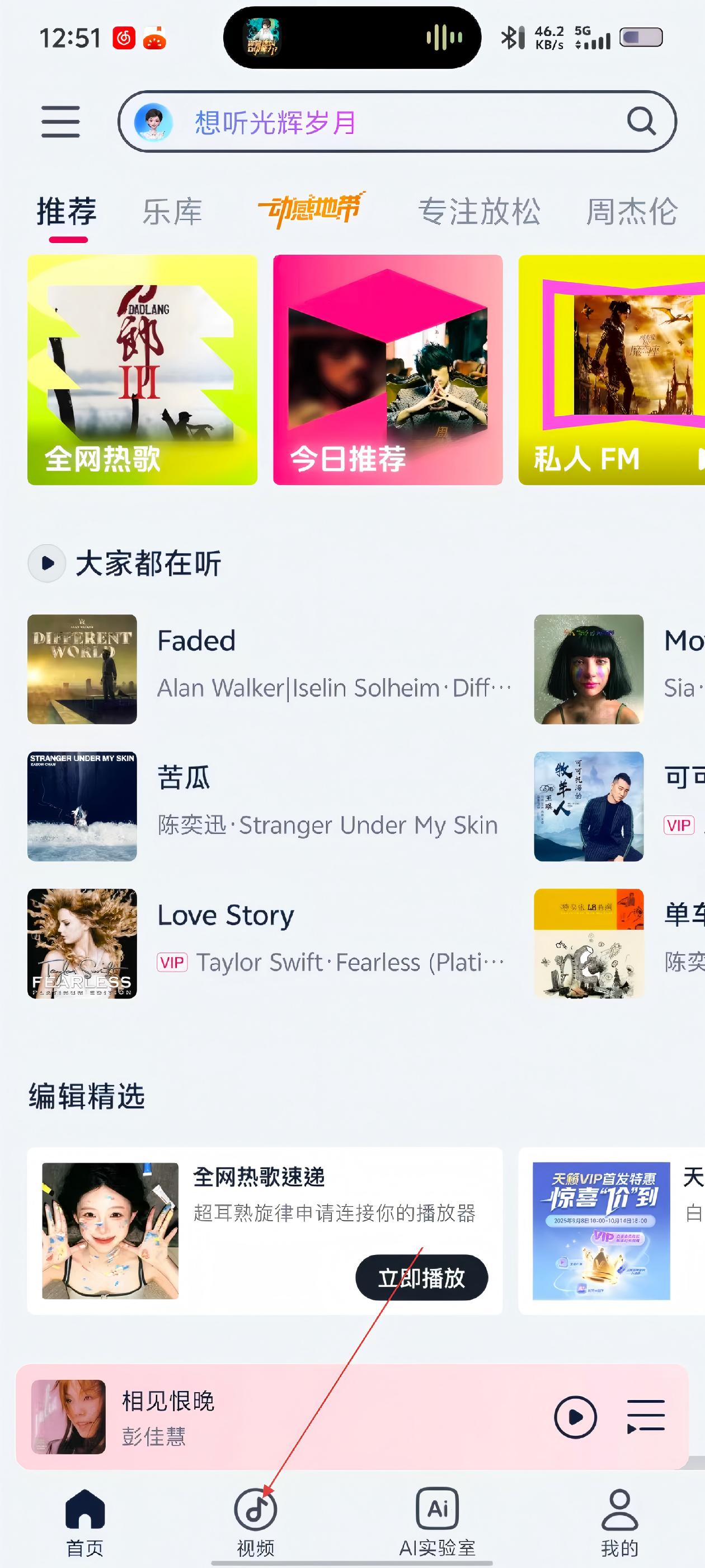 2、进入APP首页,有推荐、乐库等板块,点击底部【视频】,进入视频相关页面。