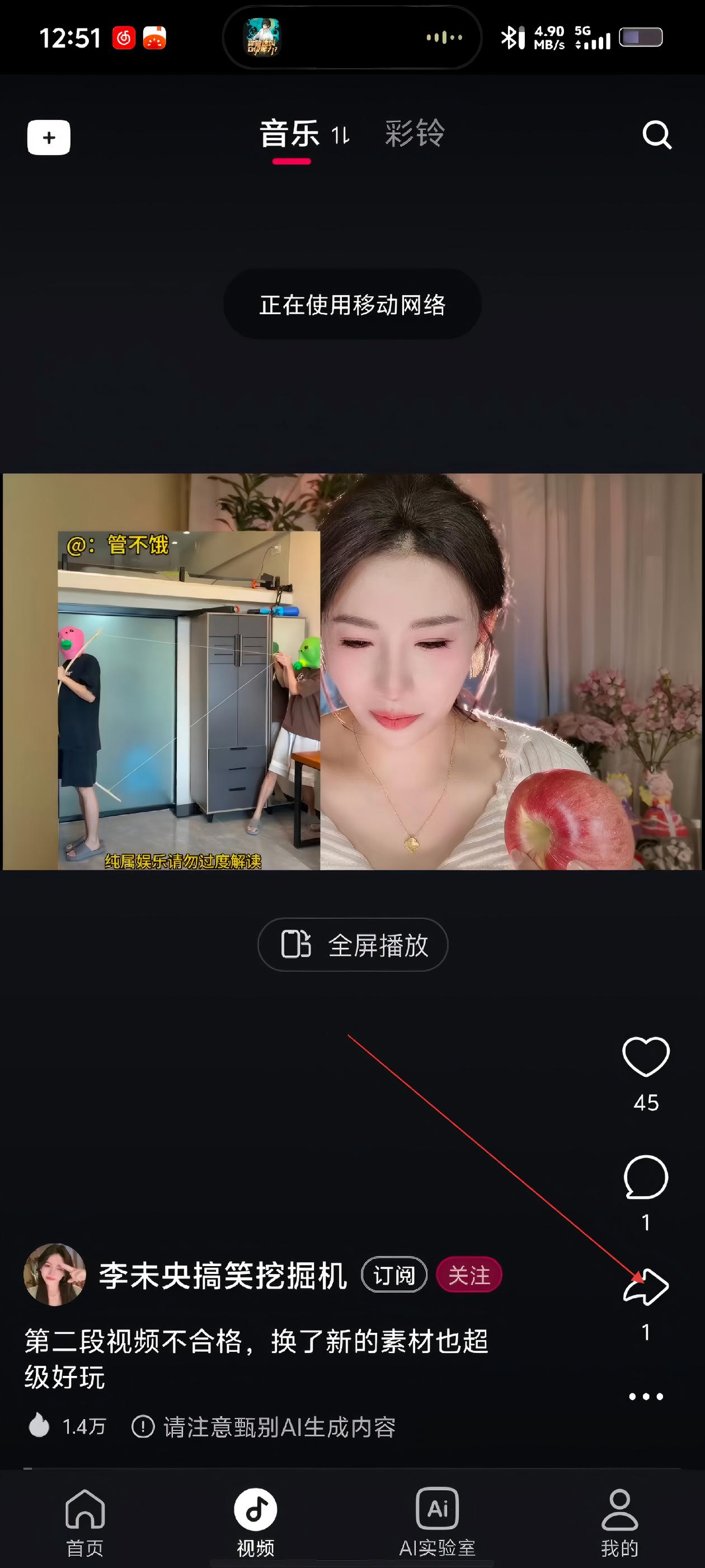 3、在视频播放页面,可看到视频内容,点击右侧分享图标,准备分享视频。