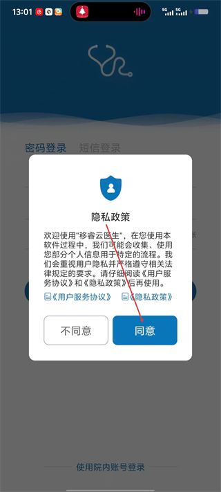 1、打开应用后,在隐私政策弹窗中点击【同意】,进入登录界面。