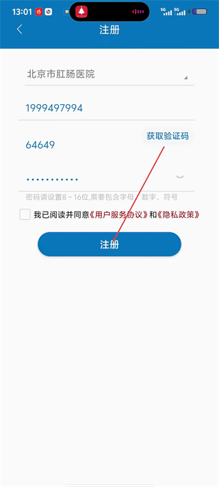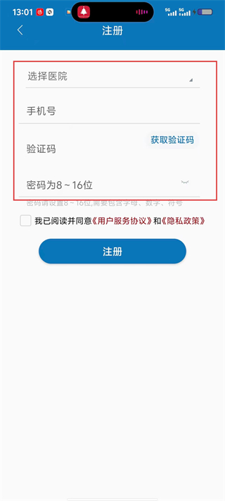 3、在注册页,依次完成:选择对应医院、输入手机号、点击【获取验证码】并填写、设置8-16位包含字母/数字/符号的密码。