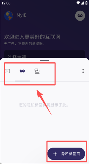 3、点右下角隐私标签页图标,无痕模式即刻开启不留痕迹。