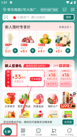 2、进入京东七鲜界面,点击七鲜板块,可查看新人限时专享价、新人多单礼等优惠信息。