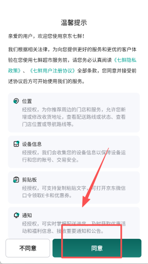 1、使用京东七鲜前,阅读七鲜隐私政策等相关协议,点击同意即可使用其服务。