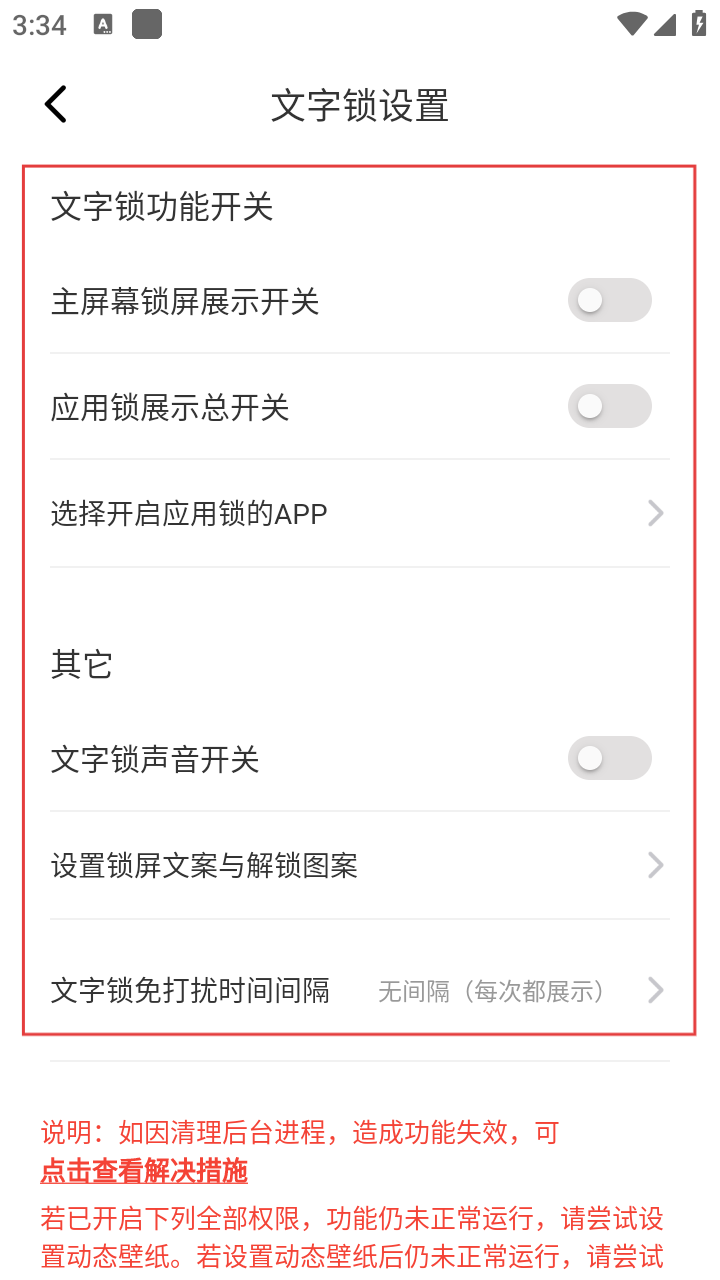 4、在文字锁设置页面,可对文字锁功能开关、主屏幕锁屏展示开关等进行设置,打造专属文字锁效果。
