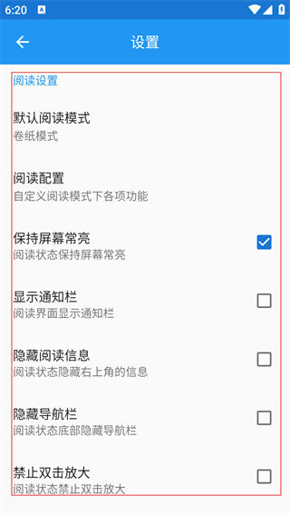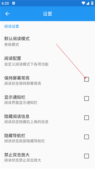 4、点击【保持屏幕常亮】选项,开启后阅读状态将保持屏幕常亮。