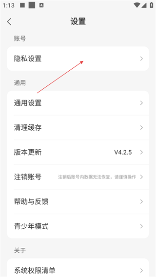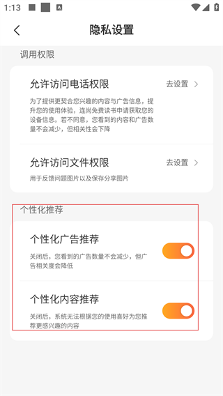 3、在连尚读书设置界面,点击【隐私设置】可进入隐私设置页面,查看和调整权限及推荐设置。