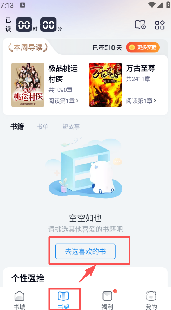 1、进入书架板块,点击 “去选喜欢的书” 按钮,可挑选心仪的书籍。
