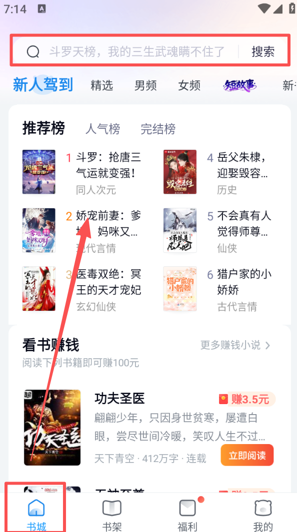 2、切换到书城页面,借助顶部搜索框输入小说名称,能快速查找作品。