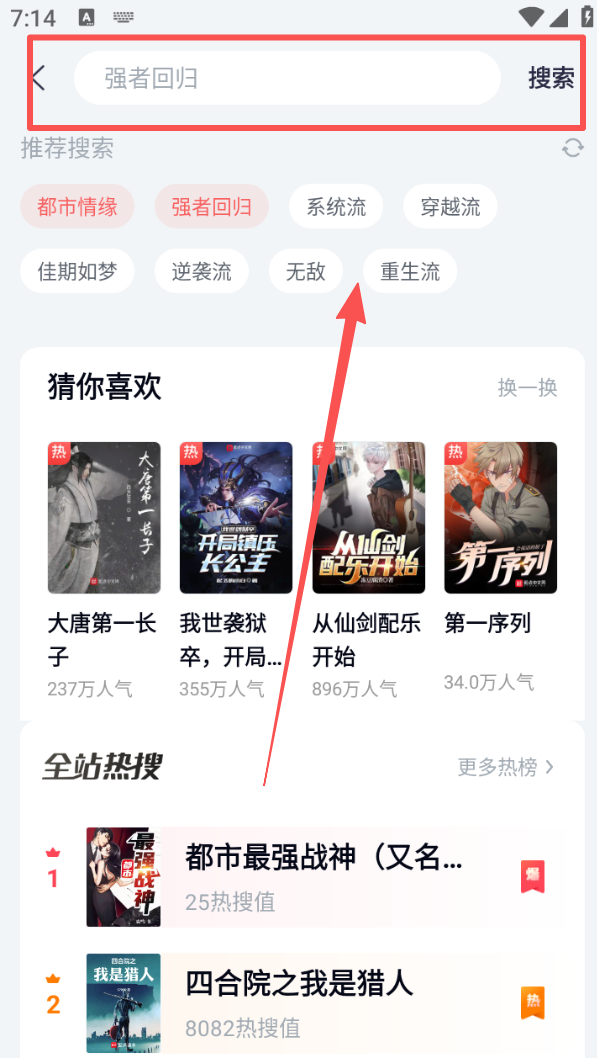 3、在搜索页面,可选择 “强者回归”“系统流” 等标签,筛选对应类型的小说。