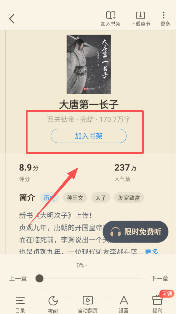 4、找到感兴趣的小说后,点击加入书架按钮,方便后续随时阅读。