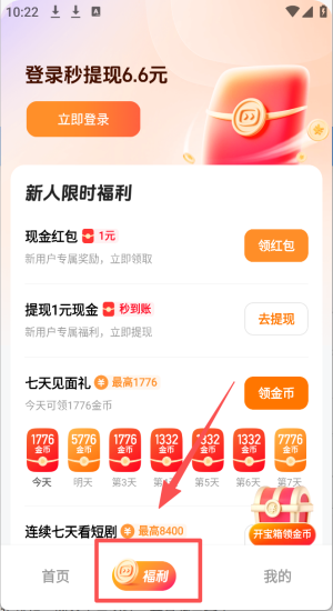 3、点击“福利”标签,查看并领取新人福利和金币。