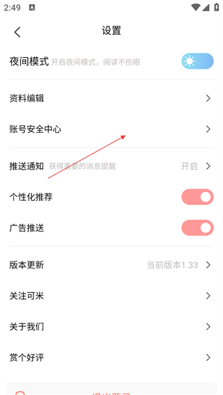 3、在设置界面,可找到【账号安全中心】选项,点击可进入账号安全界面。