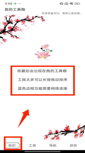 1、进入 “我的” 页面,顶部显示 “我的工具箱”,下方有关于收藏、排序、网络需求的说明,底部是 “我的”“工具” 等导航栏。