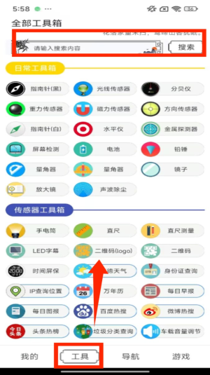 2、切换到 “工具” 页面,顶部有搜索栏,下方分 “传感器工具箱” 等板块,展示了指南针、水平仪等各类工具选项。