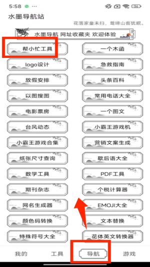 3、点击 “导航” 进入水墨导航站页面,顶部有提示语,下方排列着 “帮小忙工具”“logo 设计” 等多个功能入口。