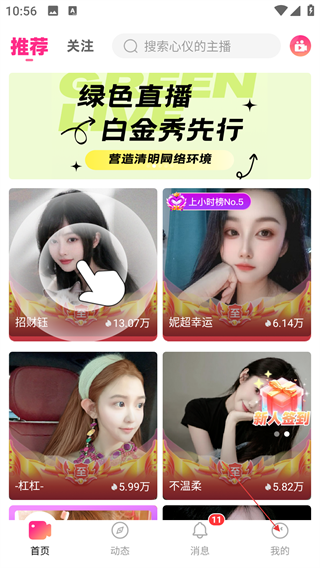 1、进入软件首页,可在【推荐】栏浏览主播,也可使用【搜索心仪的主播】功能查找,还能点击底部【我的】进入个人页面。