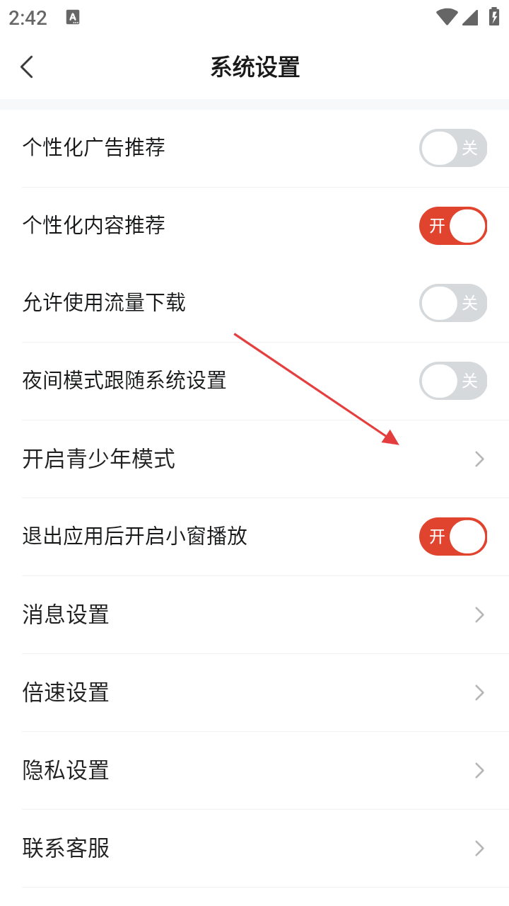 3、在设置页面中,找到【开启青少年模式】选项并点击,进入相关设置页面。