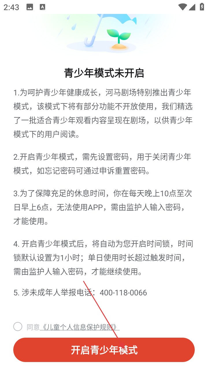 4、进入青少年模式设置页面后,可查看模式相关说明,若要开启,点击【开启青少年模式】按钮。