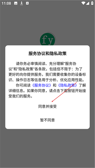 1、在应用启动后的服务协议和隐私政策弹窗中,点击【同意并接受】,进入应用主界面。